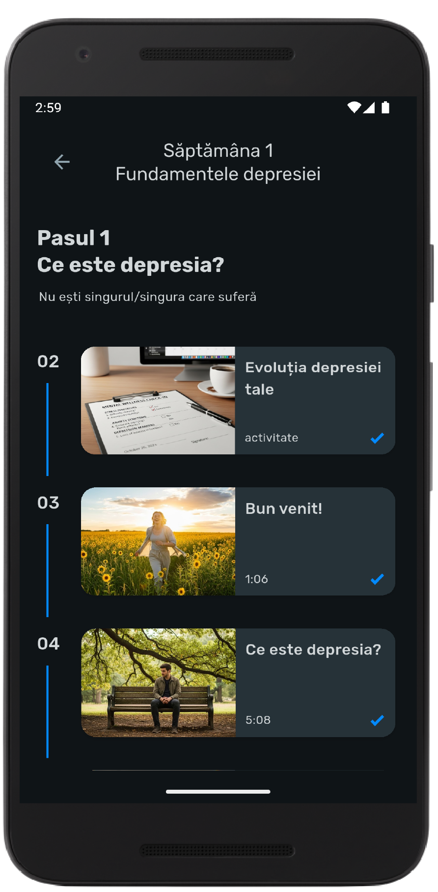 Pentru că nu trebuie să fii psiholog ca să te simți mai bine. Am sintetizat mii de pagini de cercetare în module audio scurte, pentru ca tu să obții beneficii maxime cu un efort minim. Primești acces la aceleași principii care au ajutat milioane de oameni, adaptate pentru ritmul tău, direct în aplicație.